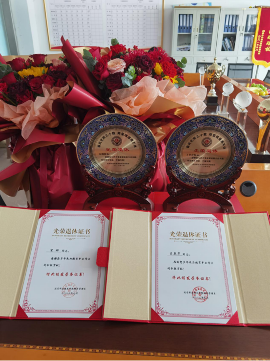 高四海书记为宋琳老师颁发颁发终生成就牌与荣退证书