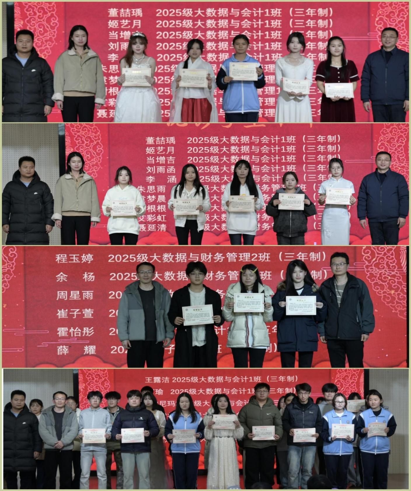晚会尾声,辅导员老师为优秀学生干部等设置了表彰环节,董喆瑀等四十余名同学依次登台领奖,他们脸上洋溢着自豪与喜悦的笑容,台下则响起了雷鸣般的掌声。这掌声既是对获奖者辛勤付出的肯定与赞扬,也是对全体经管学子的一种激励与鼓舞。这些优秀学生干部和班级贡献者们,在日常学习生活中以身作则,积极为班级和系部服务,用自己的实际行动诠释着责任与担当,成为了同学们学习的榜样。