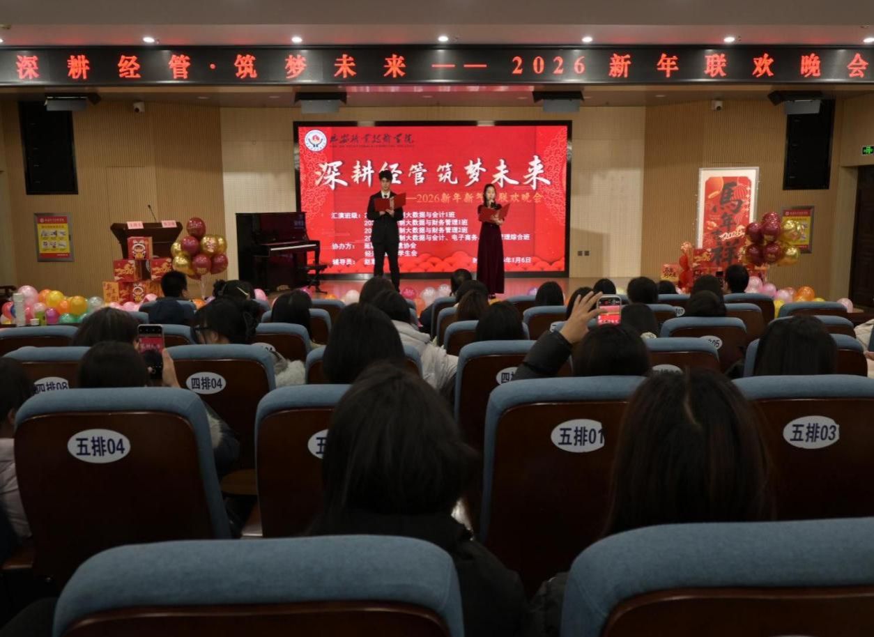 2026年1月6日晚,经济管理系2025级新生部分班级在学院第二阶梯教室联合举办“深耕经管·筑梦未来”新年主题晚会。系领导、辅导员及任课老师代表与学生齐聚一堂,共同沉浸于这场洋溢着青春活力与新年希望的盛宴。