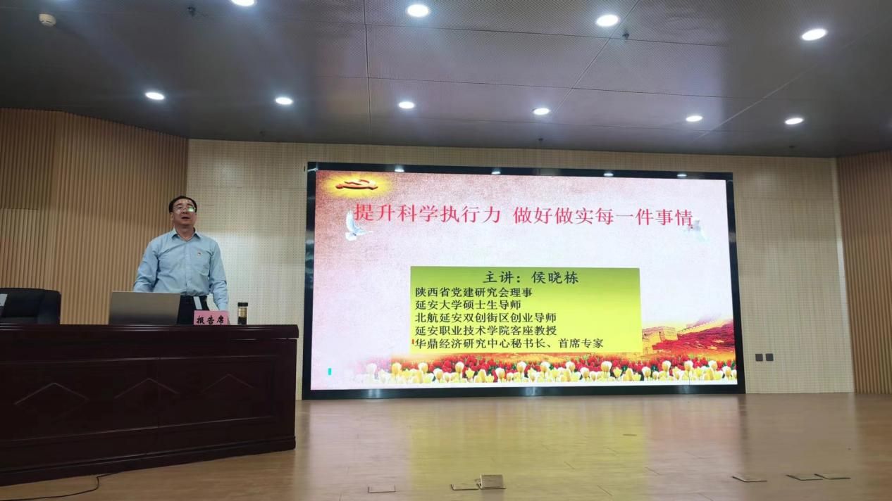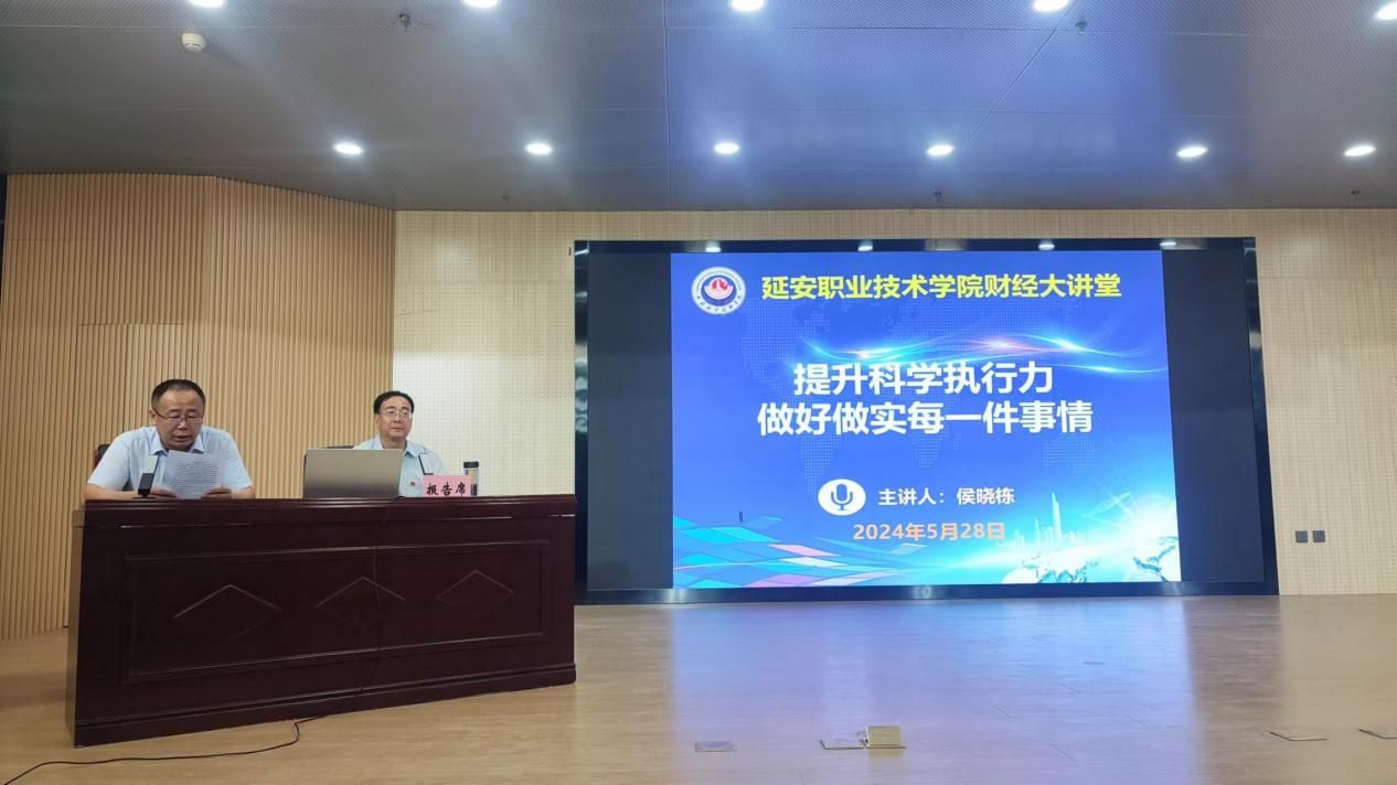 2024年5月28日晚,经济管理系特邀陕西华鼎专业集团党委第一书记、延安职业技术学院客座教授侯晓栋为我系师生作题为“提升科学执行力 做好做事每一件事情”的专题讲座。本次讲座在学院2号阶梯教室开展,由系主任王龙主持,来自经济管理系的260余名师生聆听了本次讲座。