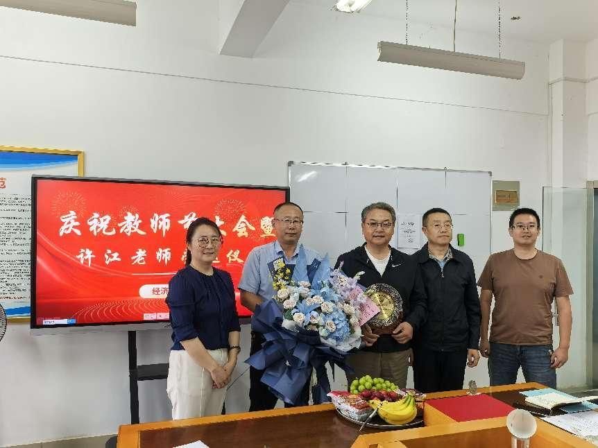 大会伊始,同学们手捧鲜花,逐一为老师们献上节日的祝福,表达对老师们的感激之情。系主任王龙以《大力弘扬教育家精神,打造新时代高素质财经教师队伍》为主题发表了致辞,鼓励大家发扬教育家精神,勇担新时代教书育人使命,对即将荣退的许江老师在院系发展中做出的贡献给予了充分肯定,对其荣誉退休表达了真挚慰问。系党总支书记高四海回顾了过去一年系部在教育教学、科研创新等方面取得的成就,并对全体教职工的辛勤付出表示感谢。