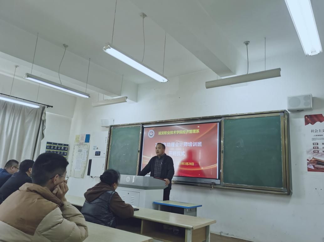 为坚定学生备考信心、强化学生备考紧迫感,经济管理系于2025年3月28日下午在11号楼A502教室举行“2025年助理会计师培训班”开班仪式。系主任王龙、系党总支书记杨晓东、教学科科长王小锋及任课教师代表出席活动,大数据与会计、大数据与财务管理专业72名学生参加。仪式由教学科科长王小锋主持。