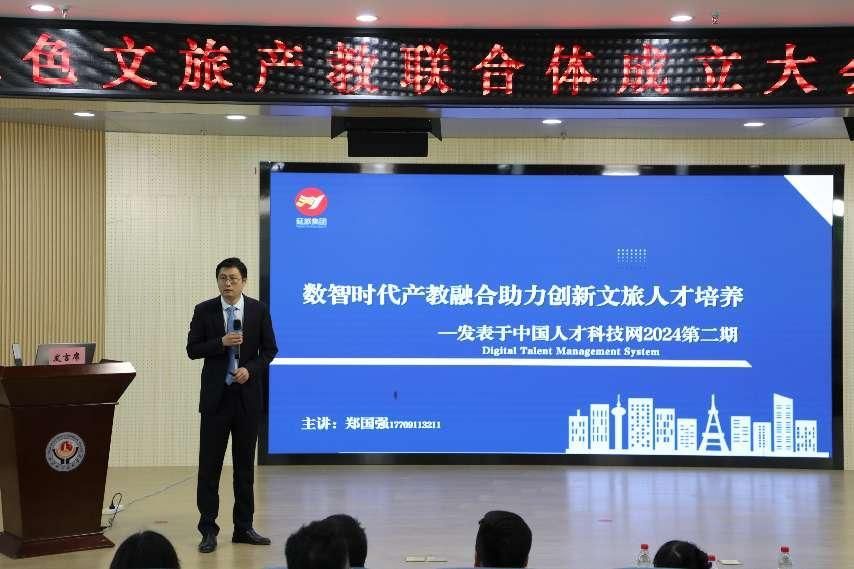 会议邀请陕西旅游住宿业协会副会长、陕西华庭青藤酒店管理有限公司执行董事兼总经理郑国强作了《数智时代产教融合助力创新文旅人才培养》主旨报告。