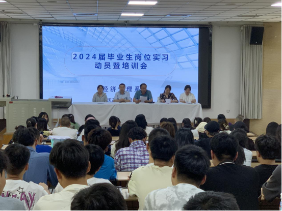 为全面落实2024届毕业生的生产实习指导工作,扎实推进专业实习工作顺利有序开展,切实提高学生就业竞争力。经济管理系于2023年7月4日在学院第一阶梯教室举行实习动员大会,出席本次大会的有经济管理系主任王龙,党总支书记高四海,学生科科长刘莹、教学科副科长张欢,全体岗位实习指导老师、2024届毕业班全体辅导员及2019级大数据与会计、大数据与财务管理、电子商务专业学生280余人。本次会议由系教学科科长王素珍主持。