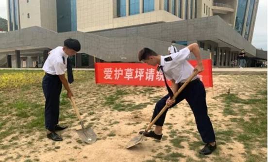 活动中,两个系部向全校师生发出“保护环境、爱护草坪”的倡议,通过班会加大宣传教育力度,对学生进行环境保护和文明行为养成教育,让学生意识到保护环境的重要性。同时,在学院图书馆两侧新栽草坪旁边拉上了“爱护草坪请绕行”横幅,向过往学生宣传保护环境的重要意义。同学们自愿组成“爱护草坪小卫队”,利用课余时间,给新栽种的草坪松土、浇水,呵护其茁壮成长。