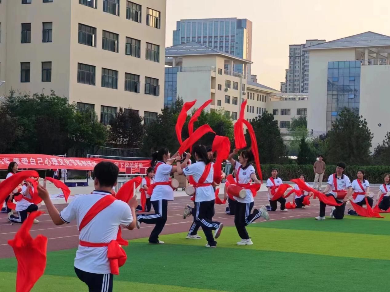 随后,精彩的腰鼓表演盛大开启。那气势磅礴的安塞腰鼓登场了,鼓手们个个精神抖擞,他们身着校服,腰间系着红彤彤的腰鼓。随着鼓槌有力地挥动,那密集而富有节奏的鼓点如暴雨般倾泻而出,仿佛是大地在震颤,又像是豪情在奔放。每一个动作都充满力量,每一次敲击都震撼人心,那豪迈的舞姿与激昂的鼓声交织在一起,让现场所有人都感受到了陕北民间艺术的独特魅力和无尽活力。