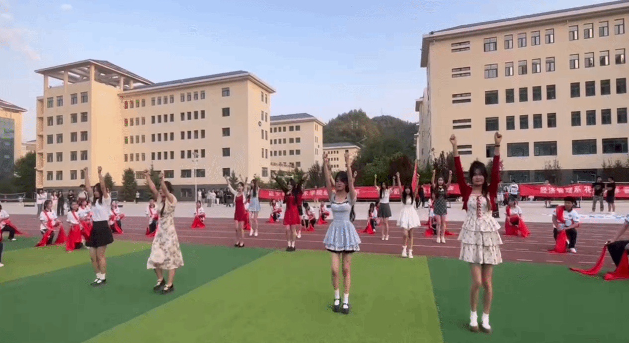 紧接着,活力四射的拉拉队闪亮登场。她们面带灿烂的笑容,身着靓丽而动感的服装,手持闪耀的花球。她们的动作整齐划一,充满韵律感,时而跳跃,时而旋转,每一个动作都洋溢着青春的气息。她们用灵动的身姿和热情的表演,为运动会增添了一抹绚丽的色彩。
