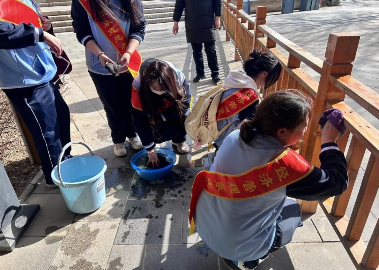 活动现场,同学们认真细致地仔细清理着垃圾、擦拭栏杆,上演着一场生动的劳动教育现场课。他们边劳动、边思考,大数据与会计专业学生思考着怎样给垃圾分门别类,丢进不同的“账户”桶;电子商务专业的学生则是谋划怎样通过“红色文旅”直播间开展环保理念宣传更为高效……