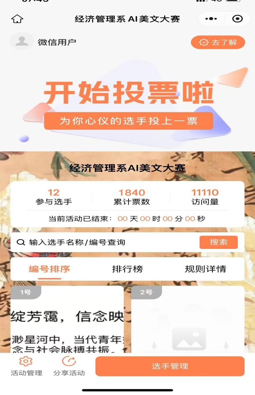 在初赛阶段,由系内资深教师组成的评审团,秉持公平、公正、公开的原则,从文章的创新性、思想性、文学性以及 AI 工具运用的巧妙程度等多个维度,对参赛作品进行了严格筛选。最终12篇优秀作品脱颖而出,进入决赛。决赛环节采用线上投票与线下创作过程相结合的方式,通过大众投票访问量达到一万多,累计票数1840票,积极的促进了系部活动的宣传,提高了活动的宣传效果和参与率,经专业评审打分,评选出一等奖 1名、二等奖 2名、三等奖 3名。