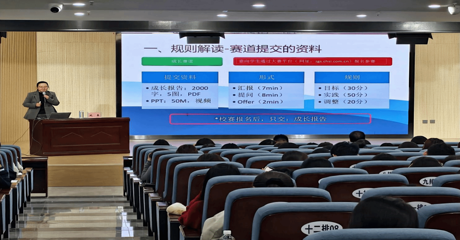 巩晶老师详细介绍了备赛流程、报告撰写、心态调整等方面事宜。建议学生在撰写成长报告或简历时,要注重内容的真实性与逻辑性,结合个人特点与优势进行个性化展示;鼓励学生保持积极心态,勇于面对挑战与困难,从中汲取经验与教训。