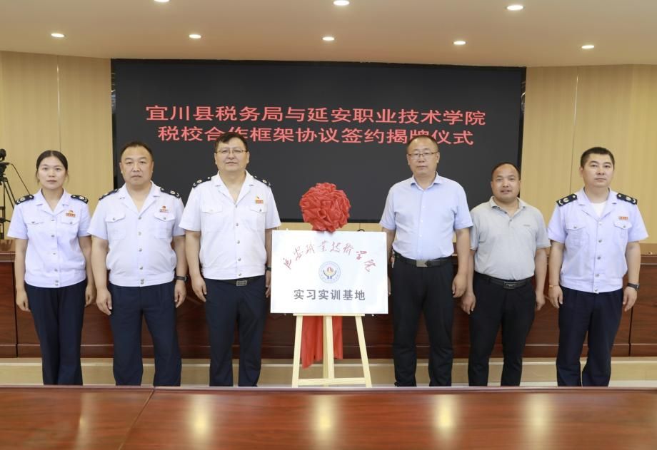 7月4日,国家税务总局宜川县税务局延安职业技术学院实习实训基地合作协议书暨签约揭牌仪式在县税务局办公楼6楼举行。宜川县税务局党委书记、局长冯文江,延安职业技术学院经济管理系主任王龙、教学科科长王小锋,宜川县税务局领导班子成员、机关全体及各分局所负责人、50岁以下干部参加了本次活动。