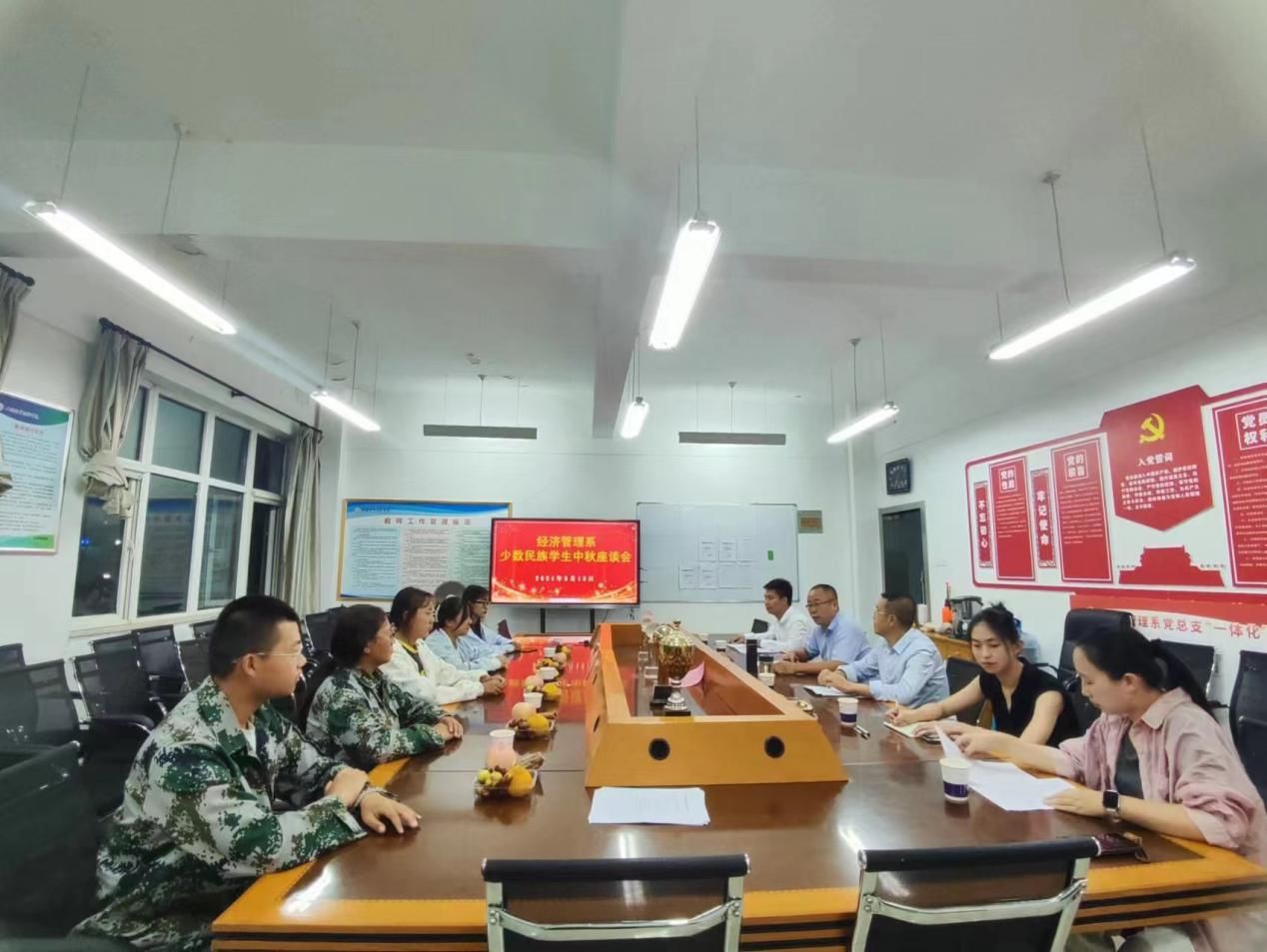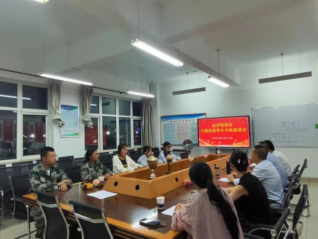 9月13日晚,经济管理系在11号教学楼A栋301会议室举行了首届少数民族新生座谈会。师生欢聚一堂,共话“双节”,会议室洋溢着节庆的喜悦气氛。