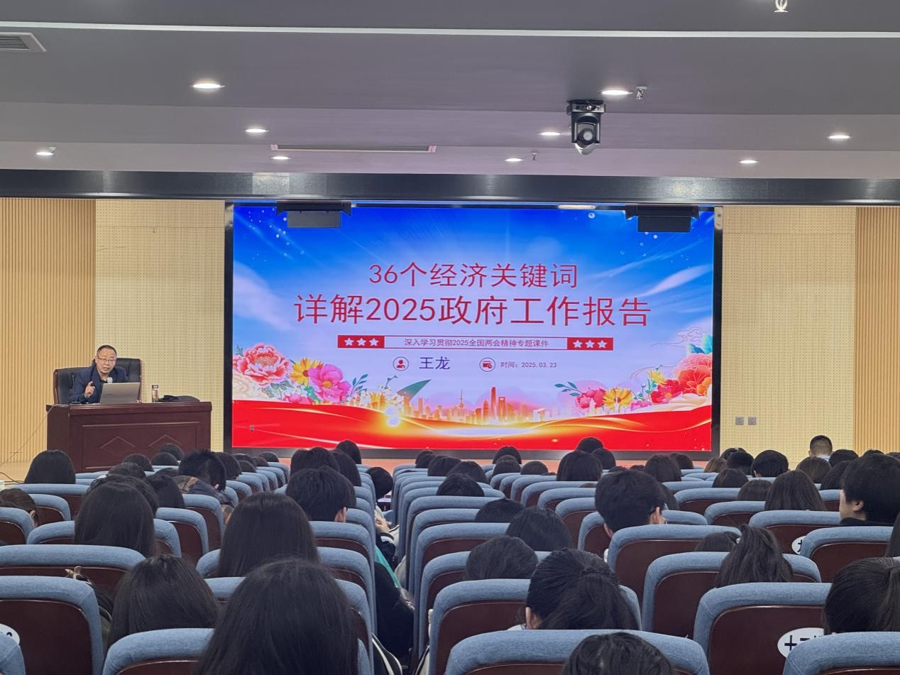 为深入学习贯彻2025年全国两会精神,引导广大财经专业学生准确理解、充分把握两会精神实质,3月23晚在学院第二阶梯教室经济管理系主任王龙副教授以“36个经济关键词详解2025政府工作报告”为题作专题辅导。
