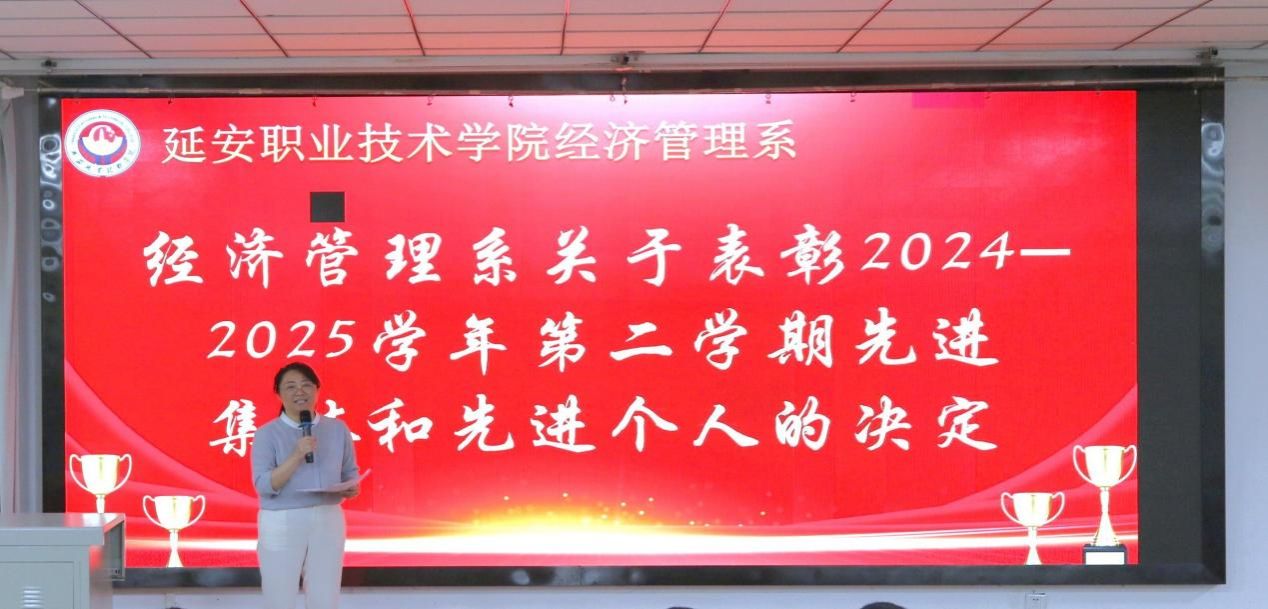 大会在激昂的国歌声中拉开帷幕。系副主任王素珍首先宣读了《经济管理系关于表彰2024-2025学年第二学期先进集体和先进个人的决定》(延职院经发〔2025〕12号),一份沉甸甸的“硬核”成绩单随之揭晓。本学期涌现出一大批闪耀的集体与个人:期中学习标兵8人、优秀信息员6人、最美笔记获奖学生25人、优秀班集体3个、优秀班干部3个、优秀宿舍17间、优秀社团成员8人、优秀志愿者2人、优秀学生会干部11人、优秀心理委员4人及庆“七•一”歌咏比赛所有参与者。奖励现场掌声雷动,榜样之光激励全场。