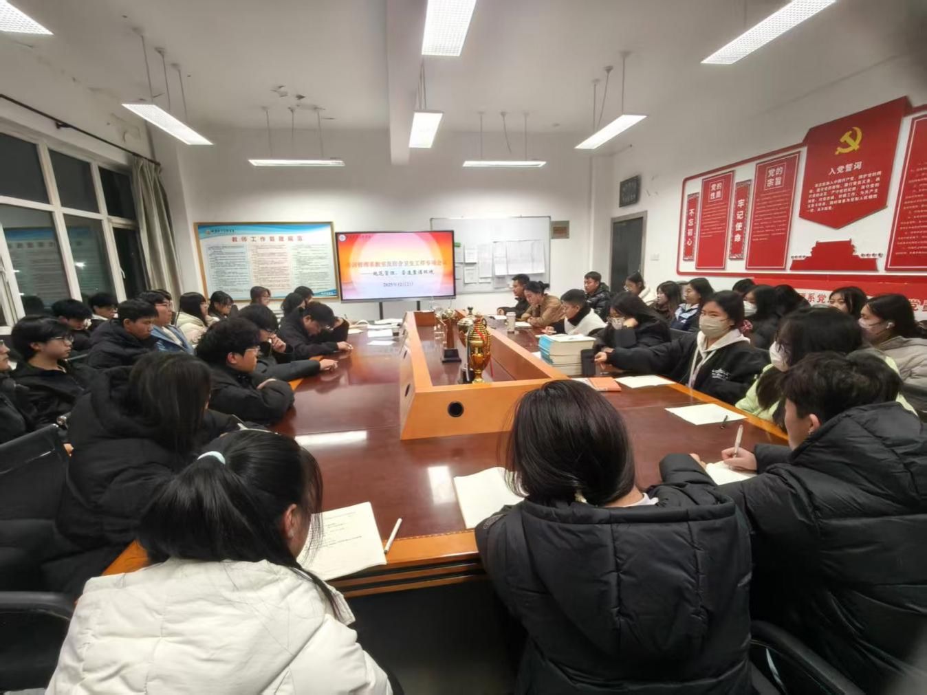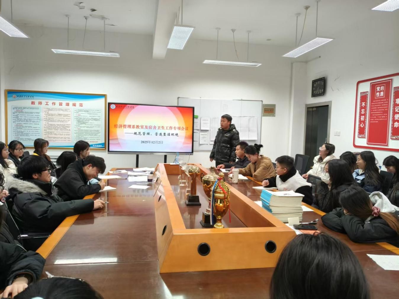 为压实校园环境管理责任、凝聚学生自治合力,2025年12月2日晚,经济管理系召开“加强规范管理,营造整洁环境”为主题的教室及宿舍卫生工作专项会议,学生会主席团成员、各班班长、宿舍舍长等50余名学生骨干参会,会议由学生科张泽老师主持。